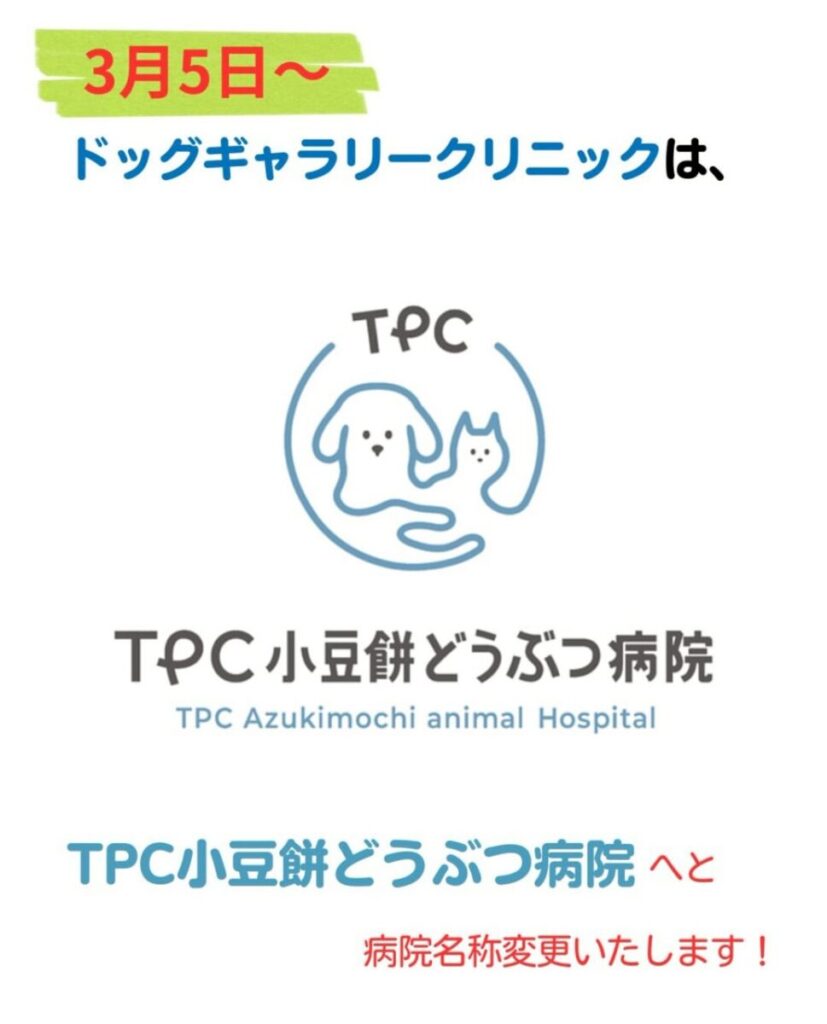 3/5(木)から、ドッグギャラリークリニックは「TPC小豆餅どうぶつ病院」へと名称変更いたします!!